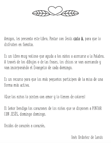 Corina van Waveren de Souviron y Sofía Rodríguez Ballester. Este libro está dirigido a los niños de todas las edades, para ayudarlos a participar de una forma más activa en la Misa de los Domingos, y de las celebraciones litúrgicas del año. Cada página es una ilustración sobre el Evangelio del Domingo, para que puedan pintar y llenar de colores, mientras se dejan iluminar con La Palabra de Jesús. La Editorial Camino al Corazón presenta con enorme alegría este proyecto pastoral para todas las parroquias y escuelas. El libro tiene autorización editorial para ser fotocopiado con fines pastorales y litúrgicos
